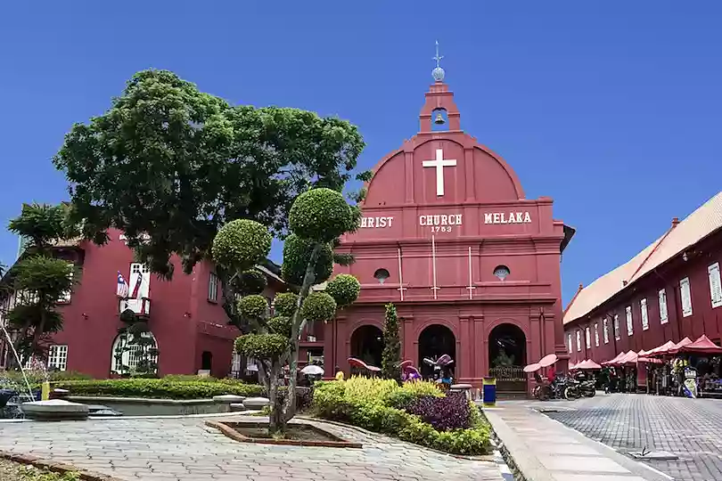 Christ Church is a landmark in Melaka. Built by the Dutch in the mid-18th century, it is the oldest functioning Protestant church in Malaysia. Built in typical 18th century Dutch architectural style, the building is noted not only for its colorful façade but for its contents, too. Among them are a bell cast in 1698; tombstones, written in Portuguese that are incorporated into the church floor, and a brass Bible stand. It is now an Anglican church.